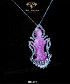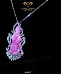 Hình dạng của Mặt dây chuyền Kim cương “Doris” – MD671 mang nét đẹp của Phật giáo. Toàn bộ mặt dây chuyền họa theo hình ảnh Phật Bà Quan Âm đứng trên đài sen. Khung vàng là đài sen, đính kim cương. Kim cương được phủ theo kĩ thuật pavé mang lại độ sáng và độ lấp lánh tuyệt hảo. Riêng Phật Bà Quan Âm được gọt đẽo từ đá quý hồng, vừa nữ tính vừa sang trọng, nổi bậc trên nền ánh sáng trắng của kim cương. Bằng sự khéo léo, tỉ mỉ ấy, mặt dây chuyền trở nên sống động vô cùng.